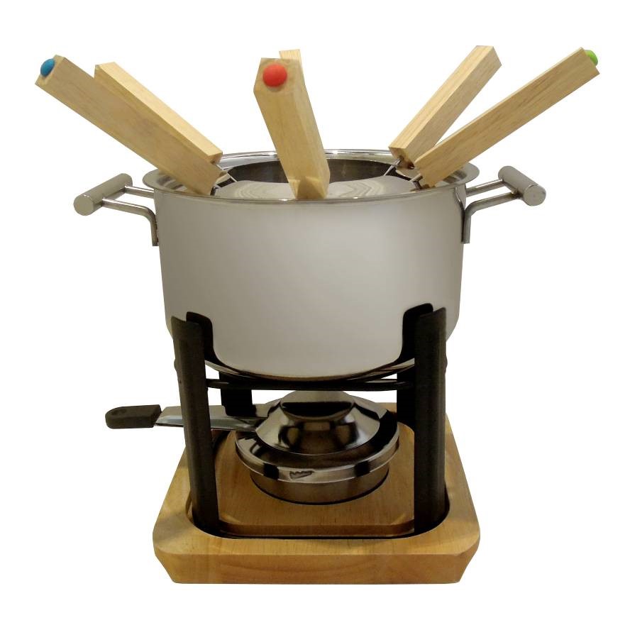 Service à fondue inox avec support plateau en bois 6 pers